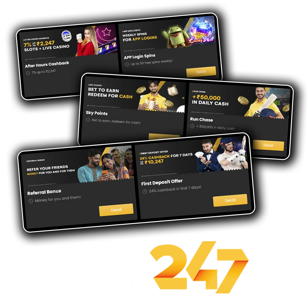 As a new user, you can claim a 24% cashback welcome bonus up to INR 10,247 on your eligible net losses. This promotion applies to casino games and sports bets that meet the campaign rules. Cashback is usually credited as bonus money after the promo period.